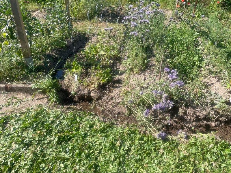 Hier sieht man ein Gemüsebeet, was nach Wasser schreit. Damit ich es einfacher Bewässern kann, sorgte ich für gute Wasserrinnen. Bis gestern wuchs darin einiges an Beikraut oder waren gar nicht vorhanden. Ich griff zum Spaten und Hacke. Den vorhanden Teil putzte ich und grub noch eine neue Rinne an der Stirnseite des Beetes. So konnte und kann ich das Beet einfach bewässern.
