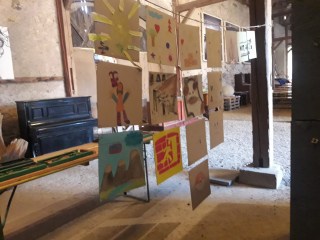Da unser Mitmachstand sowieso Zeichen- und Malsachen dabei hatte, gab es die Möglichkeit für alle Besucher eine der quasratischen Pappen zu gestalten. Sie sollten dann aufgehangen werden. Mit jan zusammen fanden wir auch einen geeigneten Platz für das Projekt. In der Scheune stand ein Einraumhaus. Um das Haus gab es Platz zum präsentieren der Bilder.