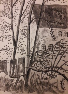 Gut ausgerüstet mit Zeichenbrett, Kohle und anderen Zeichenutensillien suchte ich nach Motiven, was ja nicht schwer fiel, doch ein wenig, denn es gab viele. Neu in der Stiftebox waren die Kohle und der Knettradiergummi… die zählten bisher nicht zu der Ausstattung. Ich probierte sie auch aus, weil ohne würde ich nichts neues lernen. Anfangs zeichnete ich einfach drauf los, mal ein paar Striche links und ein paar Striche rechts auf dem Papier, ohne die Tücken der Kohle zu bedenken… mein toller Ärmel der Jacke verwischte einiges. Doch das entmutigte mich nicht. Ich brachte die Zeichnung vorsichtiger aufs Papier. Hier eine kleine Auswahl der Kohlezeichnungen: