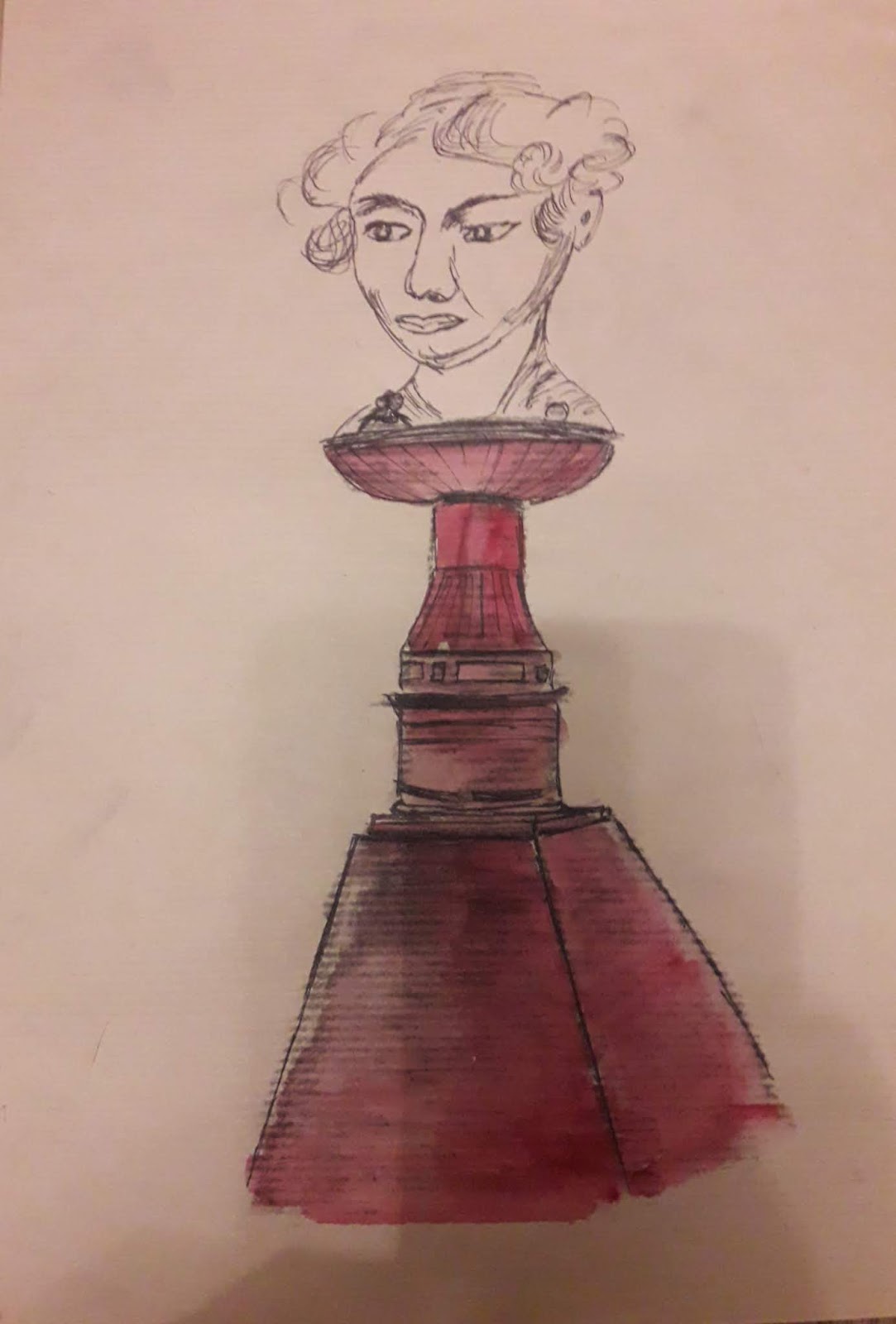 | Anfangs befand sich nur das Denkmal, mit Tusche gezeichnet und aquarellisiert, auf dem Blatt. Da es für mich, wie ein Ballkleid aussah, musste ein Kopf dazu. Diesen fand ich auf einer Infotafel neben dem Denkmal. |
