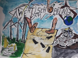 das Plakat zur Sprühaktion kennt ihr ja schon. Es wurde von mir mit Graffiti- Stencil- Technik gestaltet. Die Einladung dazu nutzen einige, wie ihr lesen konntet. Ich finde das Thema sehr interessant „(Wert) Schöpfung“, deshalb musste ich heute einfach ein paar Impulse dazu aufs Papier bringen. Mit Acrylstiften und Aquarellfarbe handierte ich heute, der Untergrund ist einfaches Aquarellpapier.