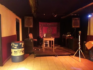 Die Bühne des Noteinganges im nächtlichen Licht, hier leider ohne Musiker, aber mit PC als Musikgeber.