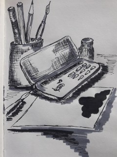Wie das nun mal so ist, als unerfahrene Tuschzeichnerin, die Tusche kleckste aus den Flaschen, aber nicht dahin wo sie sollte. Zum Glück gibt es hier in der Nähe einen der großen Kunstmärkte, bei dem Abhilfe geschafft werden kann. Ich holte mir Pipetten und eine passende Mischpalette, in der Hoffnung, dass jetzt das Arbeiten mit Tuschen keinen Frust mehr verursacht.