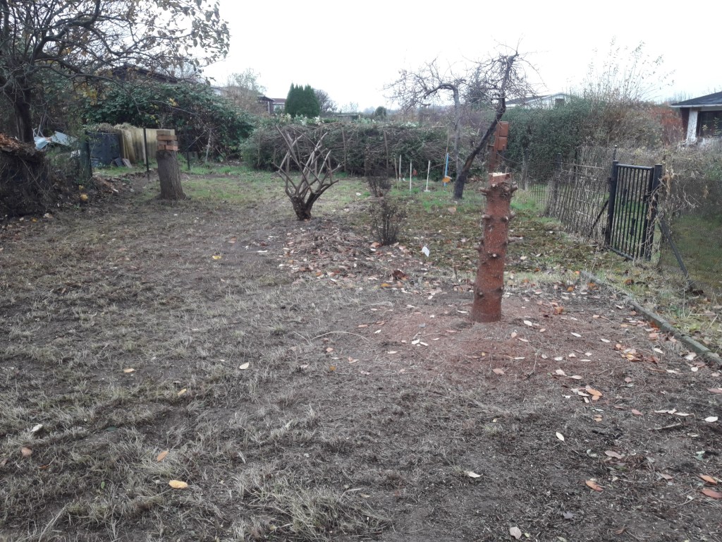 Nachdem eine nicht mehr erwünschte Koniferenhecke der Kettensäge zum Opfer fiel (ganz ohne schlechtes Gewissen, da kein ökologischer Nutzen erkennbar war), entstand ein weiter Blick durch das Gartengelände. Ich fand ihn einfach zu weit, bis zu den anderen Gärten. Dazu schnitt ich noch das verfilzte Gras. Es wirkte kahl, kalt und ungeschützt. Auch ich fühlte mich ein wenig so, da Passanten freien Blick in den Hortus hatten.