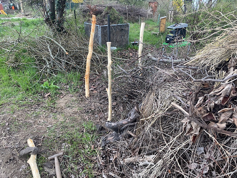 • einschlagen der Pfosten in den Boden ( Die Länge kann jeder selbst bestimmen. Die Hecke sollte eine Mindestbreite von 50 cm haben. Je höher sie geschichtet werden soll, desto breiter würde ich sie anlegen)