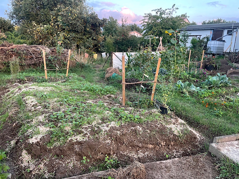 Links im Bild der Blick auf die Benjeshecke von der anderen Seite. Es wachsen immer mal wieder Brombeeren durch, die ich versuche, im Zaum zu halten.