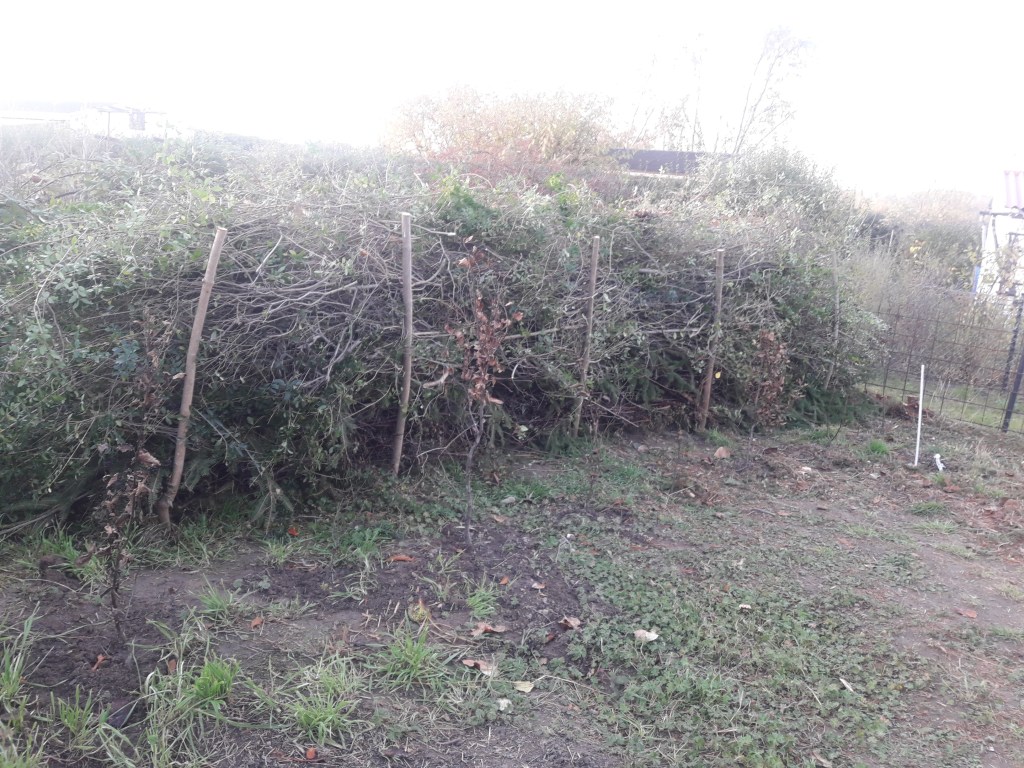 Die frisch aufgeschichtete Benjeshecke besteht aus verschiedensten Schnittgut, wie Liguster, Wildrose …