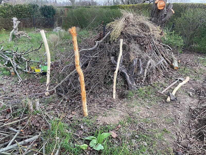 Im Frühjahr 2023 erweiterte ich, einen zu groß gewordenen, Haufen Totholz in Form einer Benjeshecke. Hierfür nutze ich dicke Äste einer Weide. Damit diese nicht neu austreiben, entfernte ich vorher die Rinde.