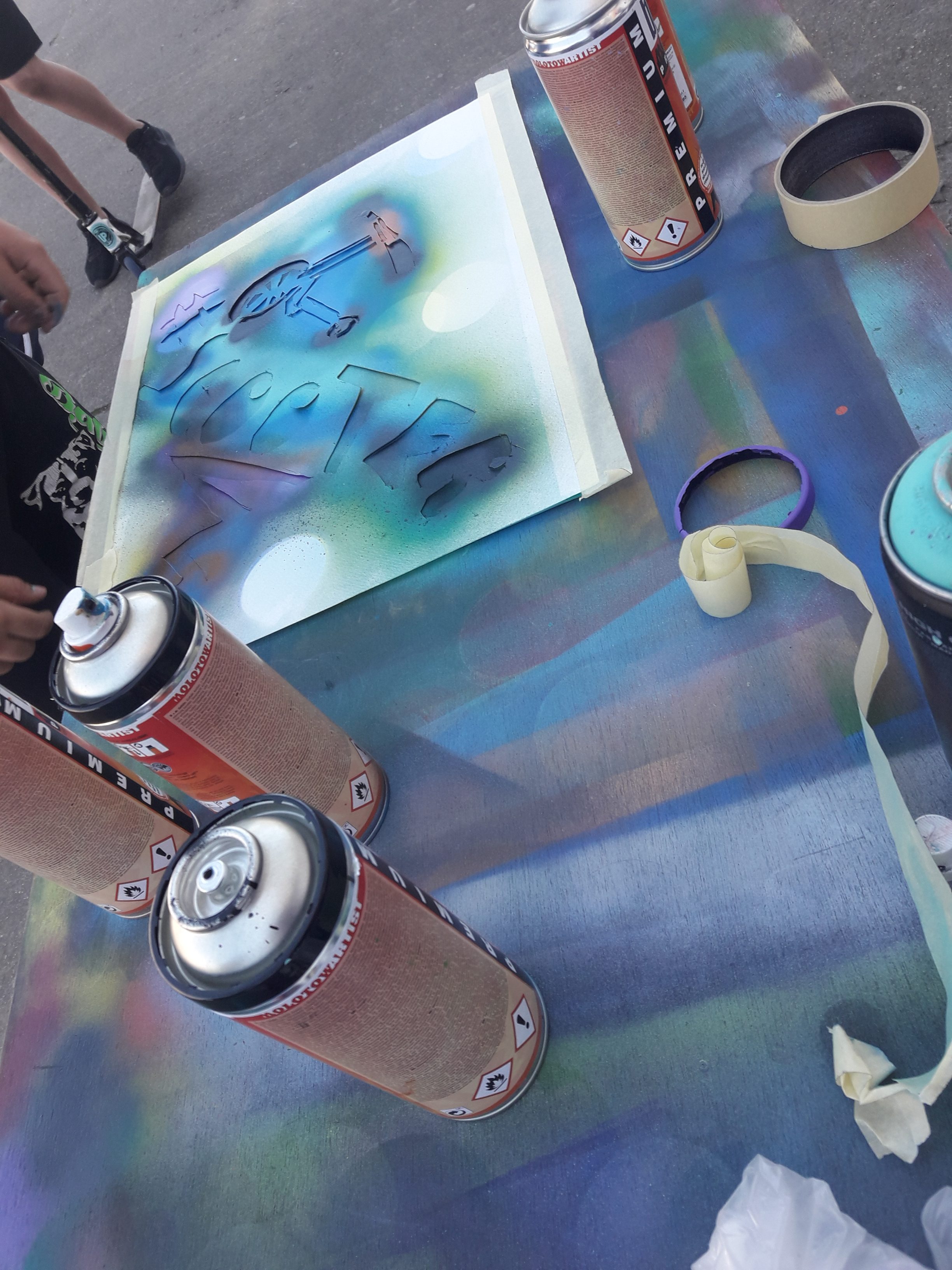 Bei den verschiedensten Workshops in den letzten Jahren brachte ich Jugendlichen die Technik des Stencil Graffiti bei. Nebenbei werden viele kleine Fertigkeiten, ohne darüber nachzudenken, gefordert. Da kommt den Teilnehmern gar nicht in den Sinn, dass beim Entwerfen mit Papier und Bleistift, das einfach Zeichnen gefordert wird. Auch die Feinmotirik kommt beim Schneiden, feiner Striche und Flächen mit dem Cuttermesser, nicht zu kurz. Sie wollen ja mit der Graffitifarbe sprühen. Hier ist der Weg das Ziel. Doch sind alle Schablonen fertig, können je nach Zeit die unterschiedlichsten Farbvarianten probiert werden. Am Ende des Kurses sind die Teilnehmer über ihre Ergebnisse meist positiv überrascht.
