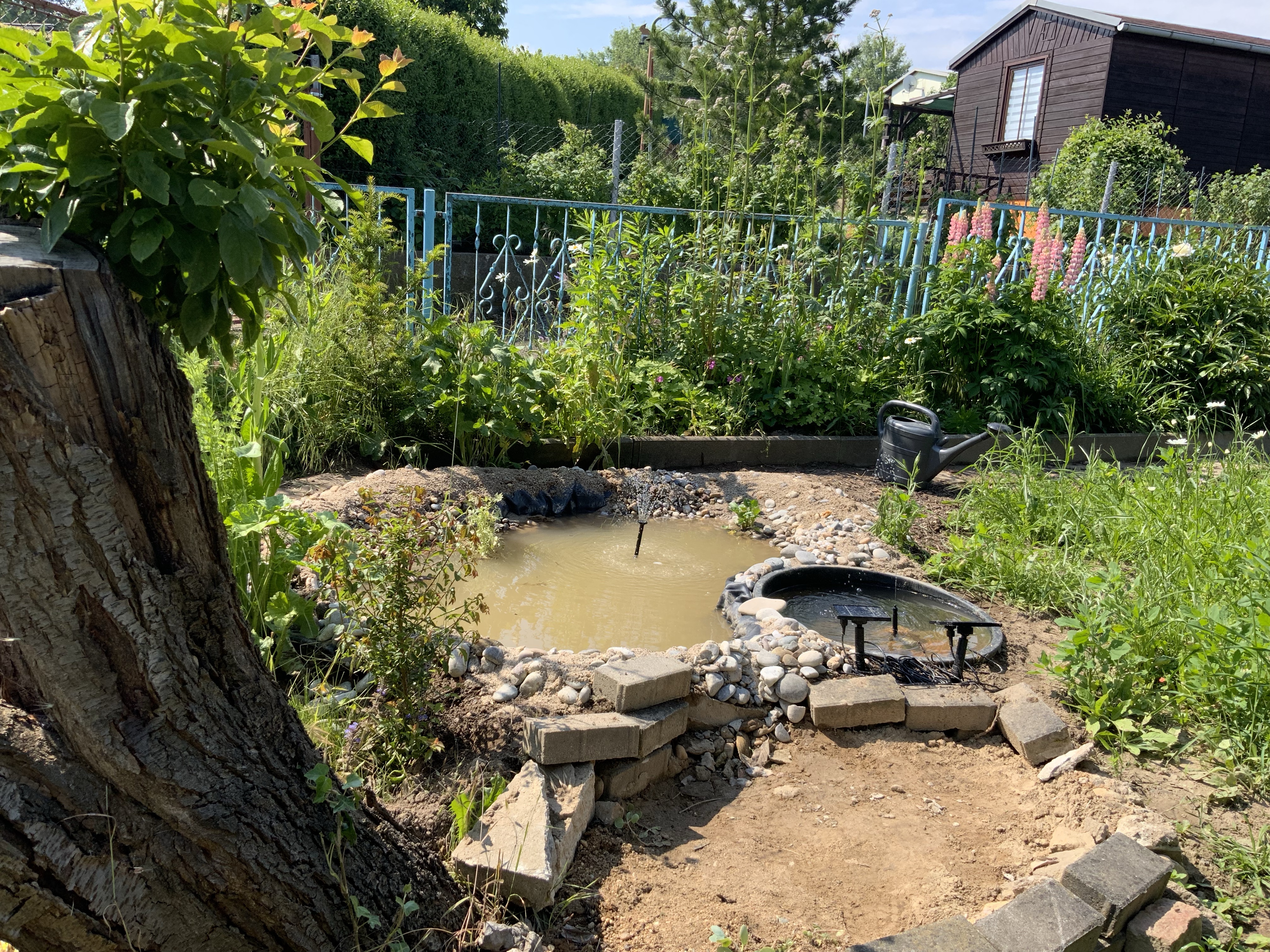Die Randbepflanzung des Teiches stand schon vor dem Bau. Auffallend tut es glaube keinem mehr. Die flachen Uferstellen nutzen gern die Vögel zum Baden.