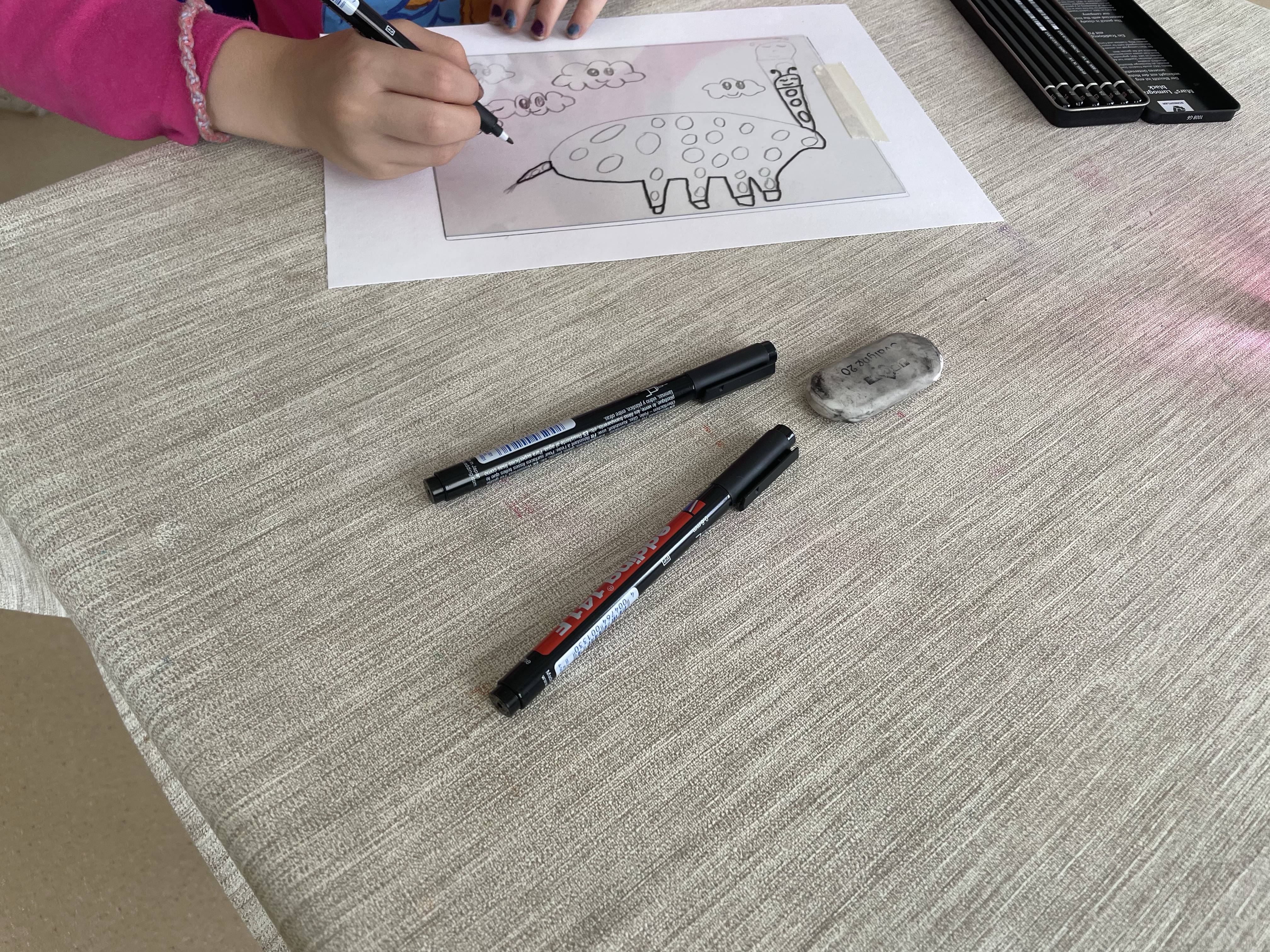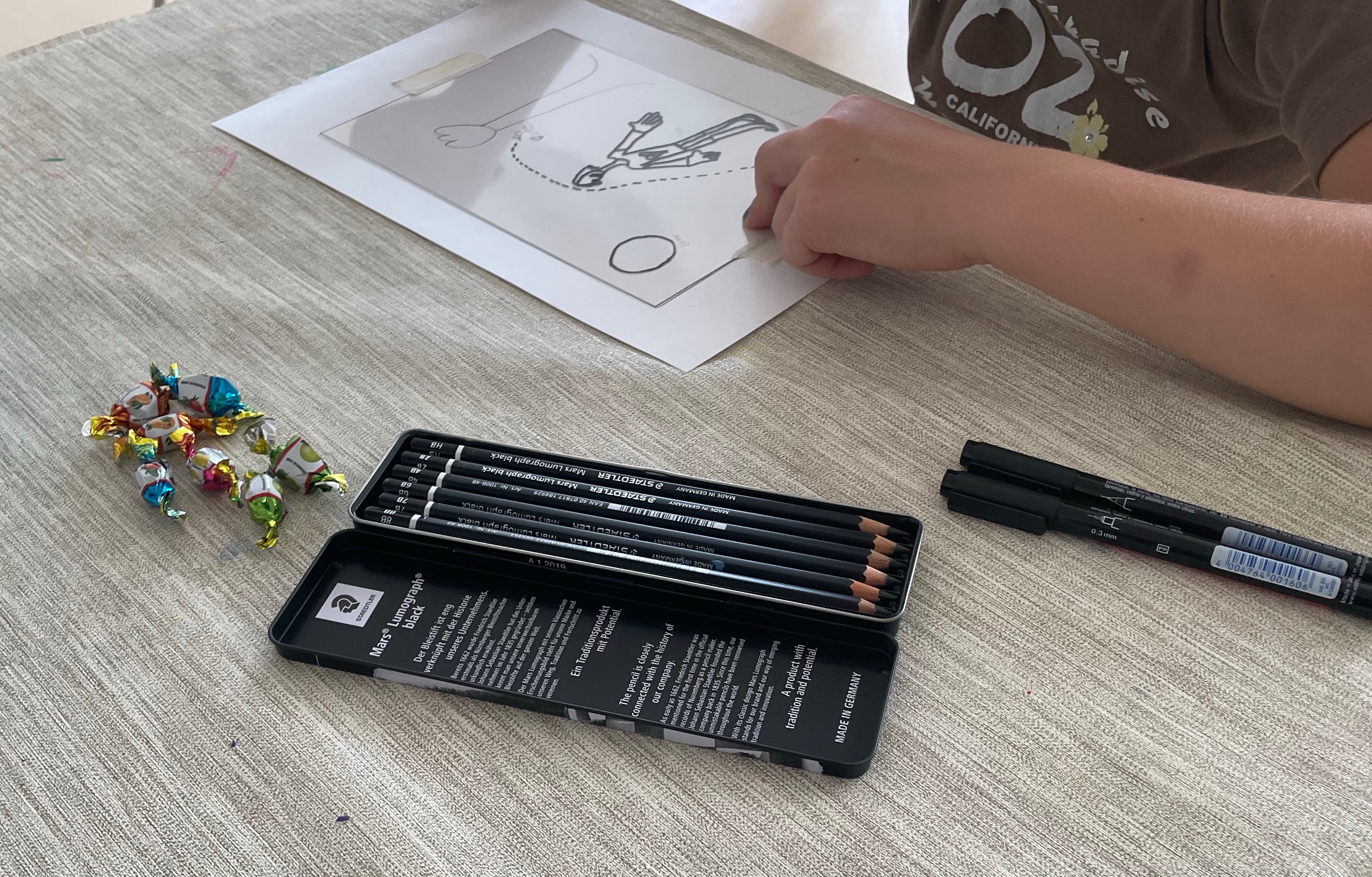 Die Kinder und Jugendlichen dürfen dieses Mal frei ihre Motive wählen. Auch das Thema für das Motiv gebe ich nicht vor. Mit ein paar gezielten Fragen nach Hobby, Lieblingstier… findet jeder sein Idee. Mit Bleistift gelangen diese Ideen auf das Skizzenpapier. Die Skizze arbeitet jeder zu einer fertigen Vorzeichnung aus, weil diese für den nächsten Schritt gebraucht wird.