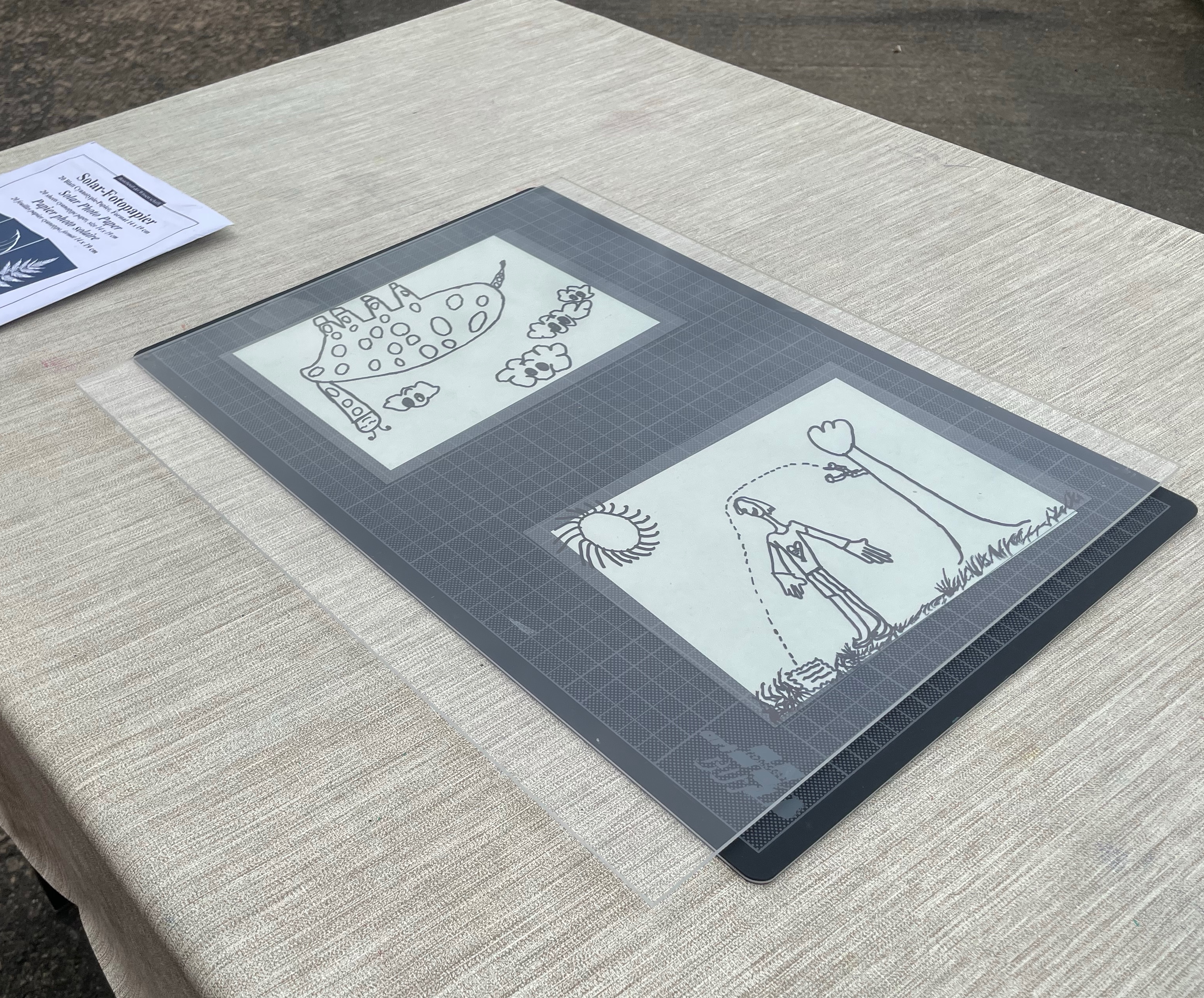 Die Sonne ist jetzt der wichtigste Helfer. Ein Tisch dient als Arbeitsbereich. Zuerst liegt eine dunkle Schneidematte darauf. Im folgendem Arbeitsschritt muss es schnell gehen. Zuerst legt man das Solarpapier darauf, dann die gefertigten Negative und zum Schluss noch eine Acrylglasplatte.